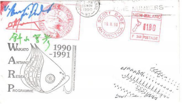 Das nachfolgende Beispiel zeigt einen frankierten Brief und die Frankiermaschine wurde als Stempelmaschine eingesetzt (=Frankaturbetrag = 0.00) – für Philatelisten ist eine solche Abstempelung natürlich interessanter als die Stempelung in der nahe gelegenen US-Station McMurdo. Der Einlieferer rechnete mit einer Aufgabe in McMurdo durch die NZ-Meteorologen, diese liessen sich aber nach der Schliessung der Poststelle Scott Base „nicht lumpen“ und merkten, dass damit nur der Poststempel von Christchurch/NZ verhindert werden sollte….