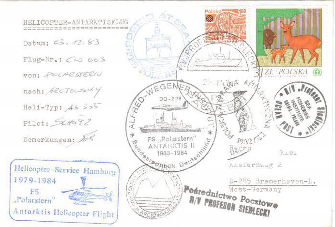 4 Konvergenz heisst der die Antarktis begrenzende Bereich zwischen 55. und 60. Breitengrad, in dem das kalte antarktische Oberflächenwasser unter die nördlichen, wärmeren Wassermassen abtaucht. Auch die polnische Station ‘Hendryk Arctowski’ wird angelaufen, Ladung bei stürmischer See gelöscht und Herr M R. in der Station seine wissenschaftliche Arbeit auf. Der zweite Fahrtabschnitt endet am 22.November 1983 in Punta Arenas. 3. Fahrtabschnitt von Punta Arenas begann am 22.November 1963 erneut in Richtung Süd-Shetland-Graben, der Bransfield Street und den Bereich nordwestlich der Weddell Sea. Am 28.11.83 wurden vier Landgeologen mit Helicopter auf der Hurd Peninsula von Livingston Island für einige Tage abgesetzt, während das Schiff den wissenschaftlichen Auftrag fortsetzte. Vom 1. bis 3.Dezember 1963 folgen Helikoptereinsätze und ein offizieller Besuch (3.12.63.) bei der polnischen Station.