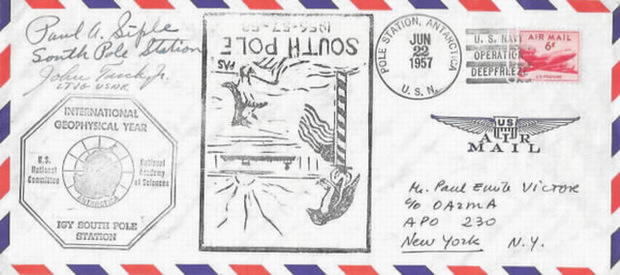 Brief von der Südpolstation 1957. Diese Station könnte theoretisch jeder Zeitzone zugerechnet werden. Sie hat die gleiche Zeitzone wie die Mc Murdo Station und wie Christchurch in Neuseeland als Ausgangspunkt der Versorgung.