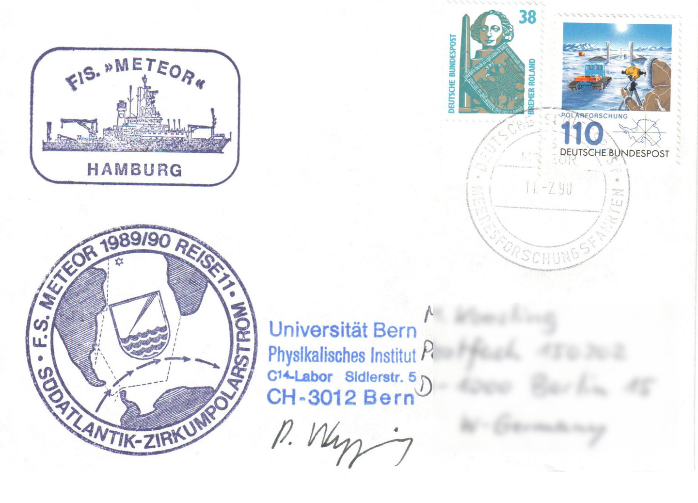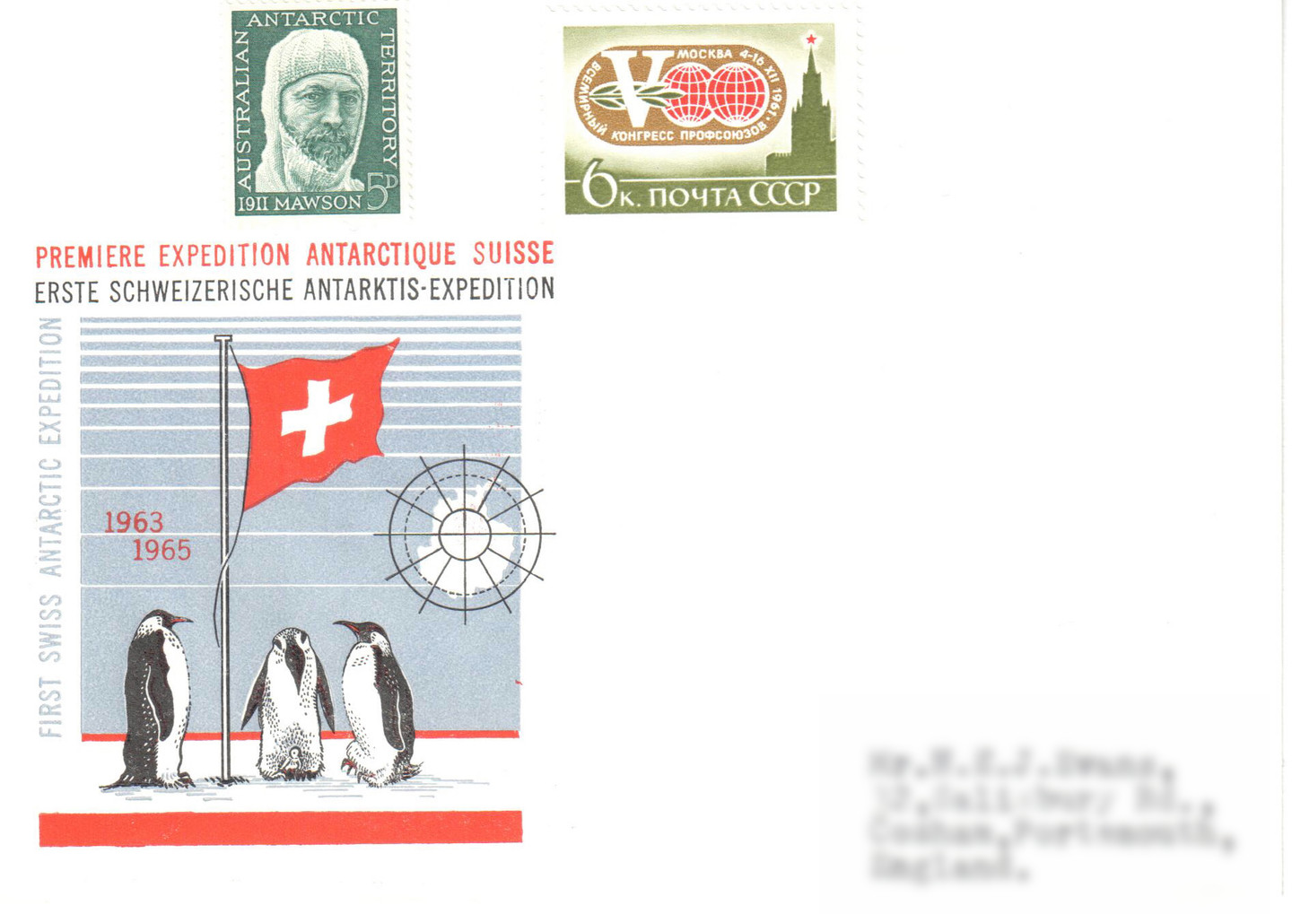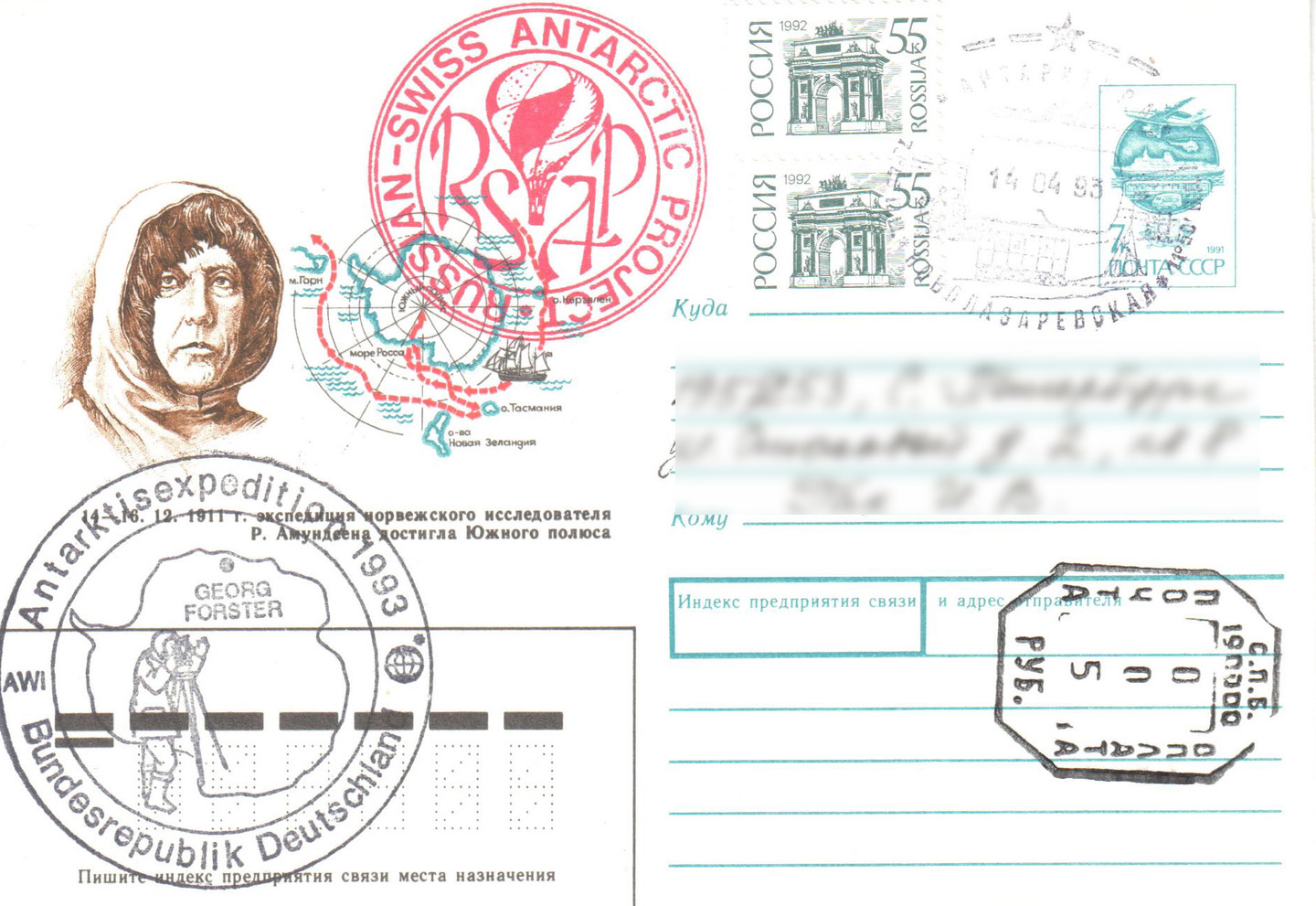 Die ersten Belege dieses Unternehmens tauchten nach der Rückkehr der deutschen Forscher von der Forster Station auf. Die Forscher aus Berlin und Leipzig wurden vom russischen Schiff „Fedorow“ von Kapstadt aus zur Station Novolazarewskaja mitgenommen und auch wieder zurückgebracht. Auf den von den Deutschen mitgebrachten Belegen waren Stempel der russischen Expedition, des Schiffes und eben auch der Stempel des „Russisch-Schweizer Gemeinschaftsunternehmens“. Ausser den nachfolgend aufgeführten Briefen ist mir nichts von diesem Projekt bekannt.