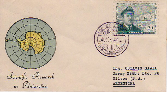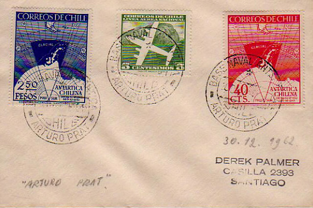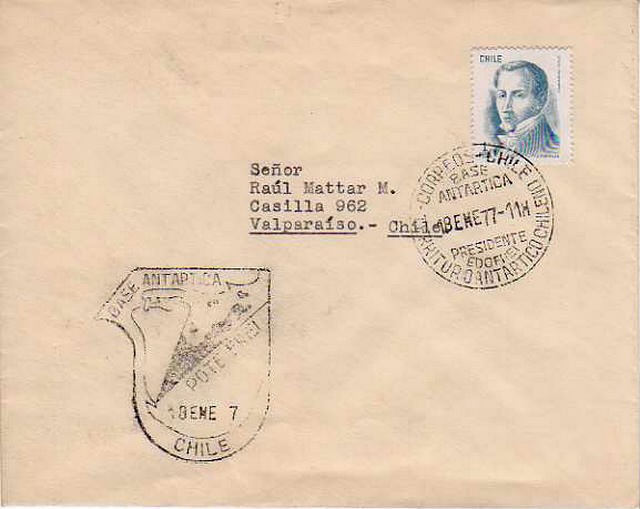 - 1974 : Inwieweit sich der Militärputsch vom vergangenen Jahr auf die Antarktisstationen ausgewirkt hat, wird sich wohl nicht feststellen lassen. Die Versorgung scheint jedenfalls nicht unterbrochen zu sein, denn es liegt inzwischen Post vom Transportschiff „Piloto Pardo“ vor, abgestempelt am 28.11.73 auf der Station Frei (die auch während der Allendezeit ihren Namen behielt) und Durchgangsstempel von Punta Arenas vom 3.1.74.