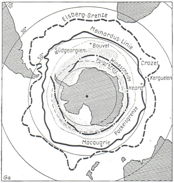 - Die antarktische Konvergenz oder Meinardus-Linie vereinigt alle Vorteile der vorgenannten Grenzlinien. Diese Grenze ist stabil, messerscharf und mit ihr ändert sich auf einen Schlag die Tierwelt des Meeres, Gehalt von Sauerstoff und Salz im Meer, von Temperatur, Nebel usw. Dieses Gebiet umfasst den Kontinent mit der Antarktischen Halbinsel, Südgeorgien, Bouvet, Heard und Macquarie. Sie heisst auch Antarktische Polarfront.